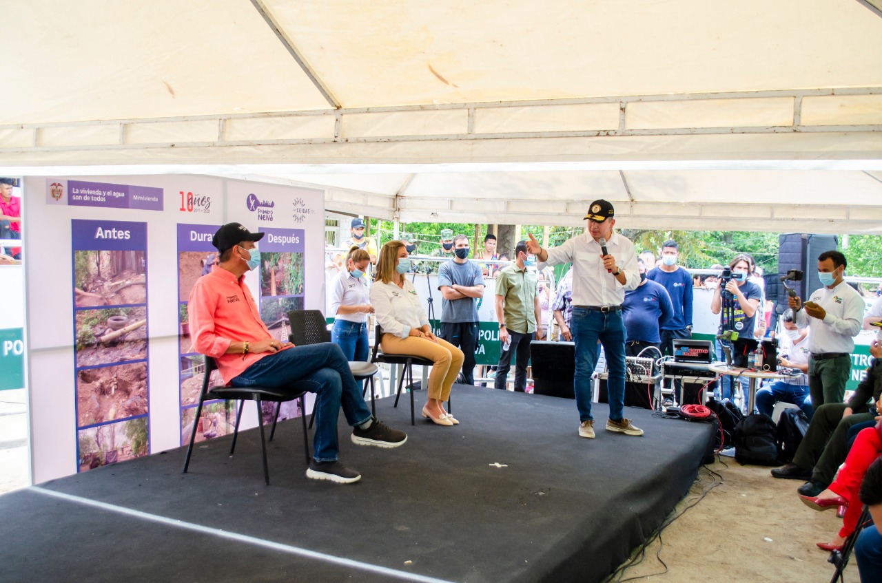 El evento que se cumplió en las entrañas del barrio, contó con la presencia del Ministro de Vivienda, Ciudad y Territorio; Jonathan Malagón González, la gerente de Las Ceibas – Empresas Públicas de Neiva, la Senadora Esperanza Andrade y el Representante a la Cámara Jaime Felipe Lozada, entre otros invitados.