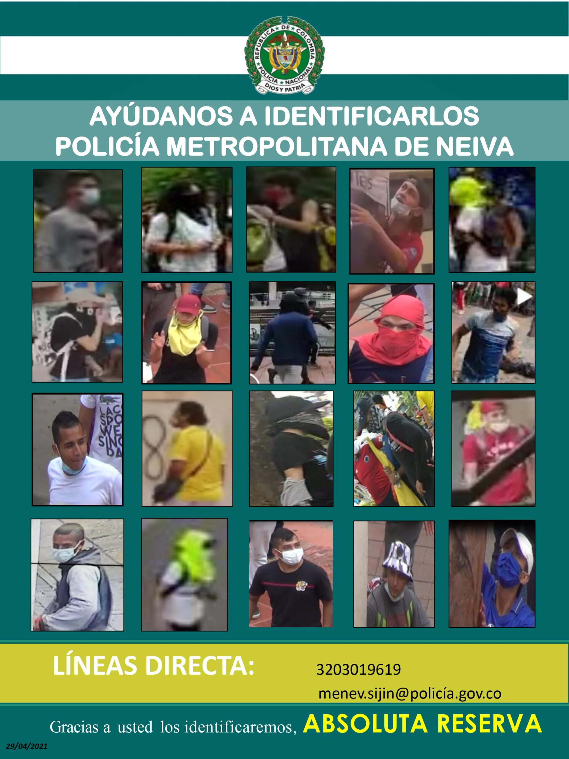 La Policía Metropolitana de Neiva presenta ante la opinión pública el cartel de las personas vinculadas con los actos vandálicos y violentos acaecidos el día 28 de abril, en desarrollo de la jornada de manifestación pública.