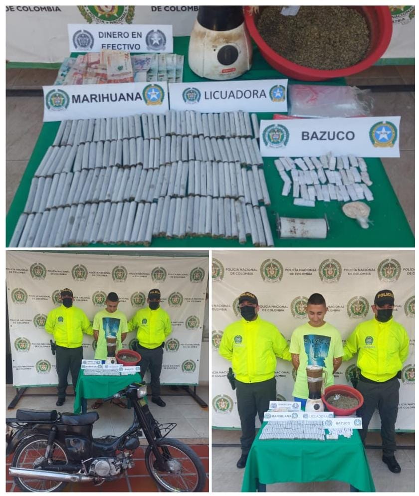 Fue así como la Seccional de Investigación Criminal a través de una diligencia de registro y allanamiento en el barrio San Isidro alto, logró la captura Miguel Ángel Flórez Medina de 21 años de edad, más conocido como “Rata”, a quien le hallaron más de 570 dosis de marihuana, 110 dosis de bazuco, elementos para dosificación (licuadora para trituración y una máquina de liar cigarrillos) y dinero en efectivo de baja denominación al parecer producto de la venta. Además, le fue hallada una motocicleta marca Suzuki, la cual figura con reporte de hurto.