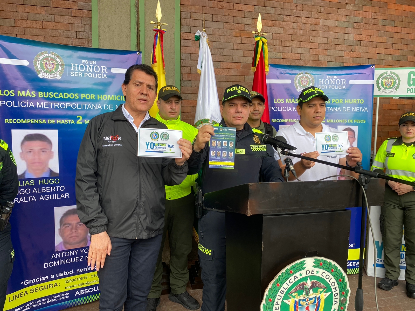 El comandante de la Policía metropolitana en Neiva, Coronel Juan Pablo Ruiz Rodríguez comandante de la Policía Metropolitana de Neiva en compañía de Raúl Rivera Cortés secretario de gobierno municipal realizaron un recorrido por las instalaciones y alrededores de la terminal de transporte de Neiva donde dieron a conocer personalmente a la ciudadanía el cartel de los más buscados recalcando que por la información que conduzca a la captura de estos presuntos actores criminales, se ofrece una recompensa de hasta 2 millones de pesos.