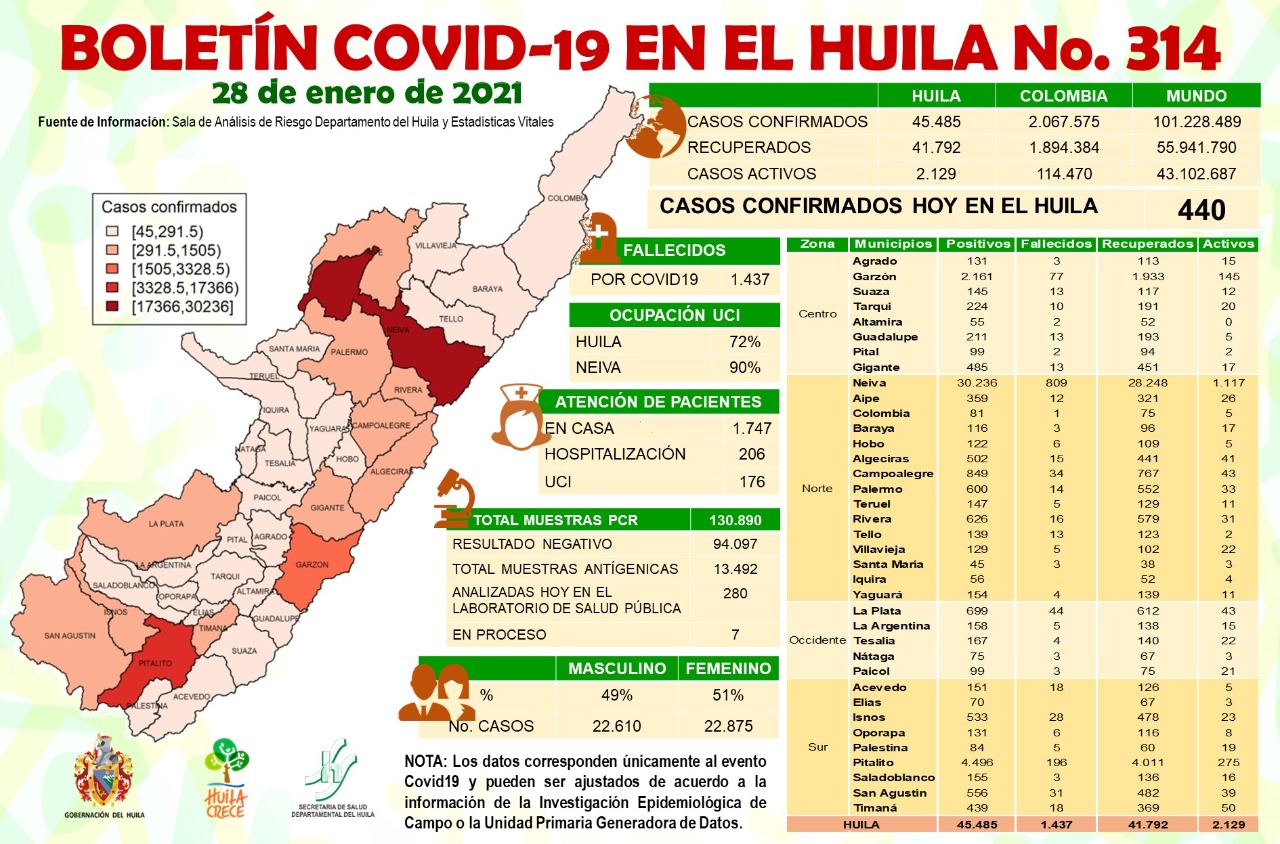 La Sala de Análisis del Riesgo del Huila confirmó este jueves 440 resultados positivos de Covid19, distribuidos así: