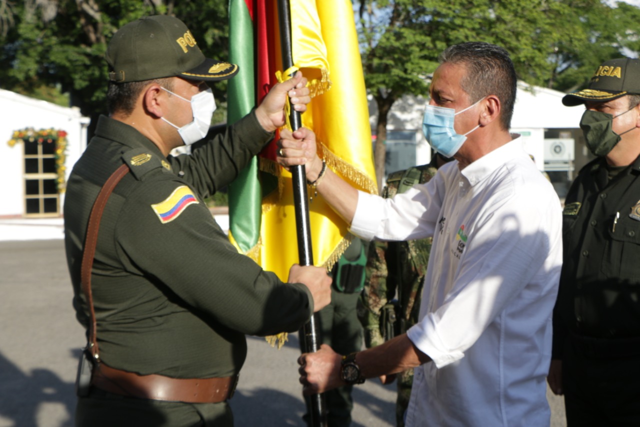 Durante la jornada de transmisión de mando, la administración municipal hizo entrega a través del alcalde Gorky Muñoz Calderón, de la bandera de la ciudad, al nuevo Comandante, a quien comprometió en una lucha frontal y codo a codo contra la delincuencia que viene azotando la ciudad.