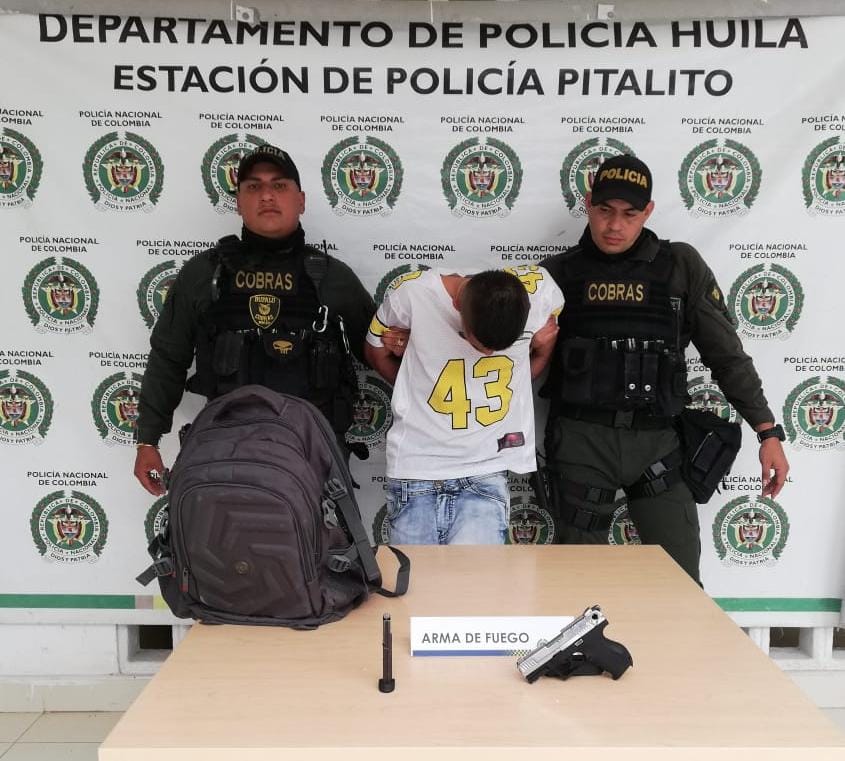 De inmediato y con la descripción de este sujeto, se logró detener a CRISTIAN DAVID PERDOMO ARTUNDUAGA de 23 años de edad, el cual portaba un arma de fuego tipo pistola, al verificar su identidad, presenta reporte de medida domiciliaria y un brazalete electrónico del INPEC; se le informa que será capturado por el delito de porte ilegal de armas de fuego y fuga de presos.
