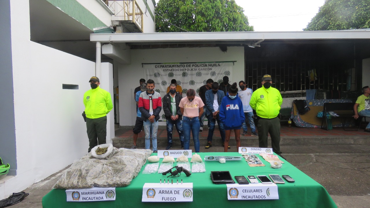 Igualmente se logró la incautación de un arma de fuego tipo revólver con 6 cartuchos, 5 kilos de marihuana, 620 dosis de bazuco, 40 dosis de cocaína, 6 celulares incautados y dinero efectivo al parecer producto de la venta.