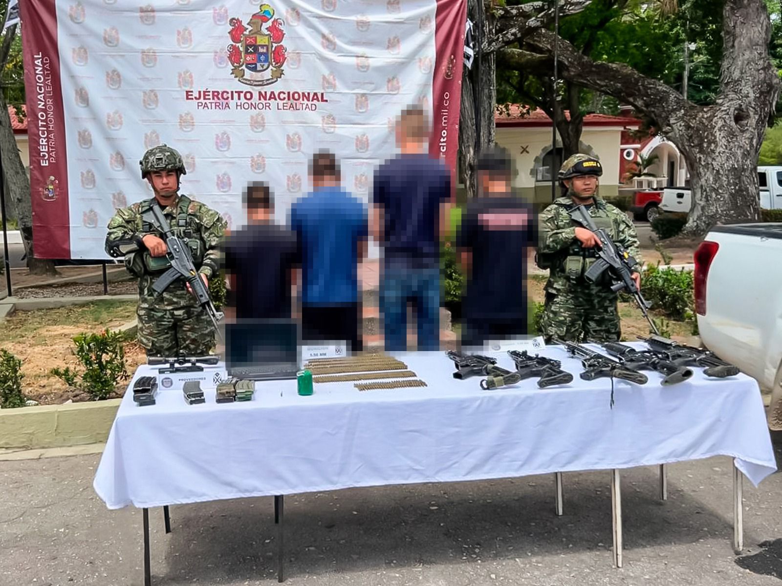 Tras su sometimiento, estas personas entregaron una camioneta, un arma corta y un computador portátil con información relevante. Gracias a estos datos, las tropas ubicaron un depósito ilegal que contenía armamento de guerra: cinco fusiles M4 calibre 5.56 mm, una pistola, munición de varios calibres, proveedores, una mira óptica Mark 4 y un artefacto explosivo improvisado tipo mina antipersona. Este hallazgo evidencia el continuo uso de métodos que vulneran los derechos humanos y el derecho internacional humanitario por parte de estas estructuras.