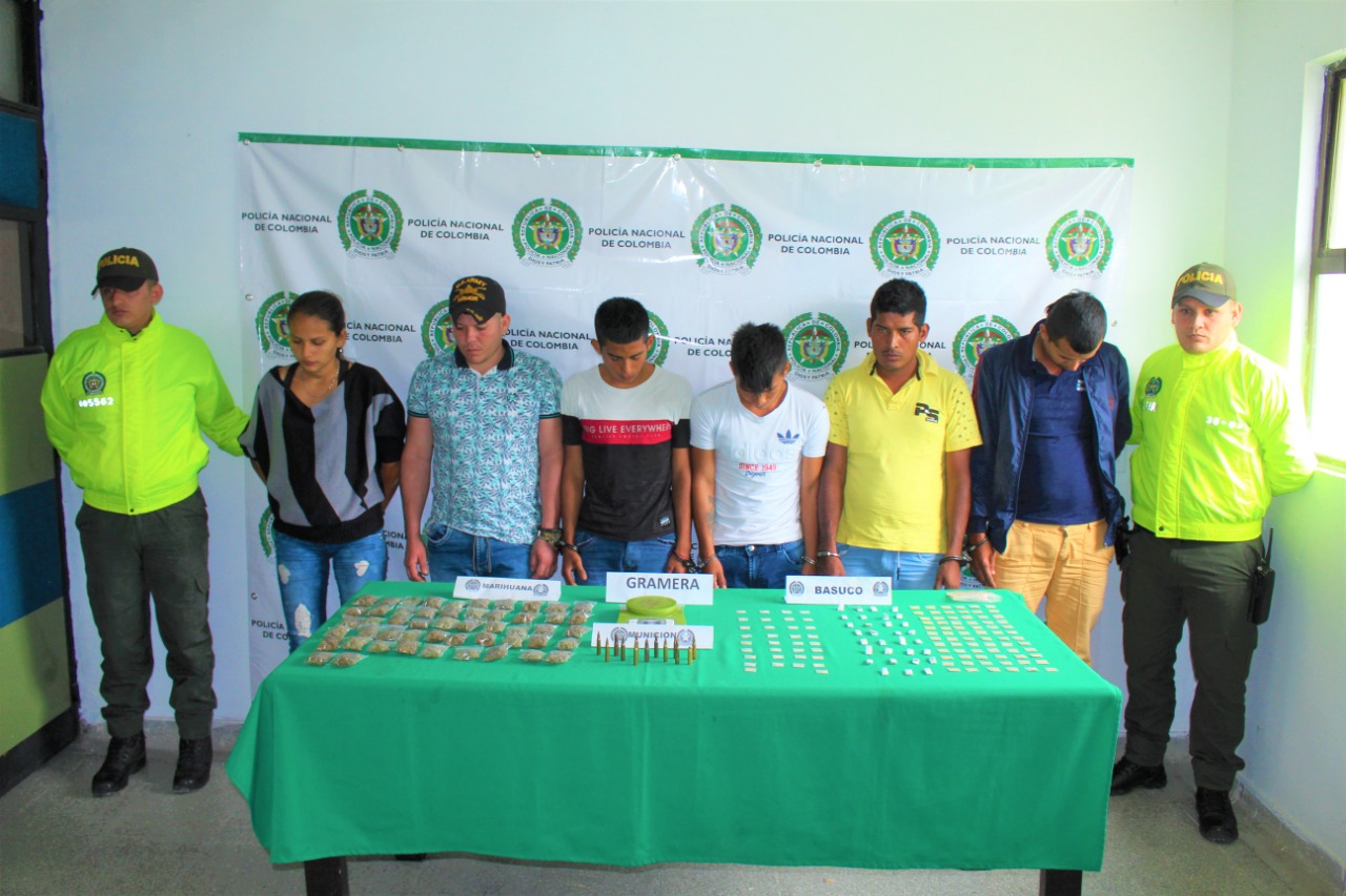 Los capturados fueron identificados como: Luis Alfonso Gaviria Carvajal alias “Guerrillero” de 37 años, Jesús Alberto Gaviria Carvajal conocido como “Chucho” de 21 años, José Jamir Bermúdez Pimentel alias “Chepe” de 29 años, Yoiner Jair Correa alias “Cabro” de 31 años, Adrian Mateo Caicedo Pisso de 19 años y Karla Dayana Villarreal Velazco de 18 años de edad, a quienes les fueron halladas 140 dosis de bazuco, 51 dosis de marihuana y armas.