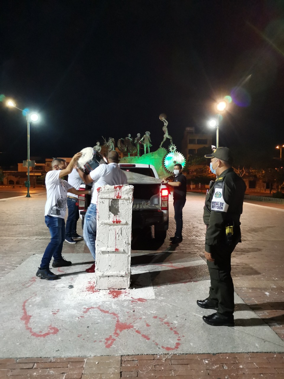 El procedimiento realizado a través de la dirección de Espacio Público, acompañado por Justicia, adscritas a la secretaría de Gobierno, contó con el acompañamiento de la Policía Nacional y el Ejército, quienes realizaron una verificación del monumento con canino antiexplosivos, con el fin de prevenir afectaciones en los funcionarios que posteriormente ejecutarían el procedimiento.
