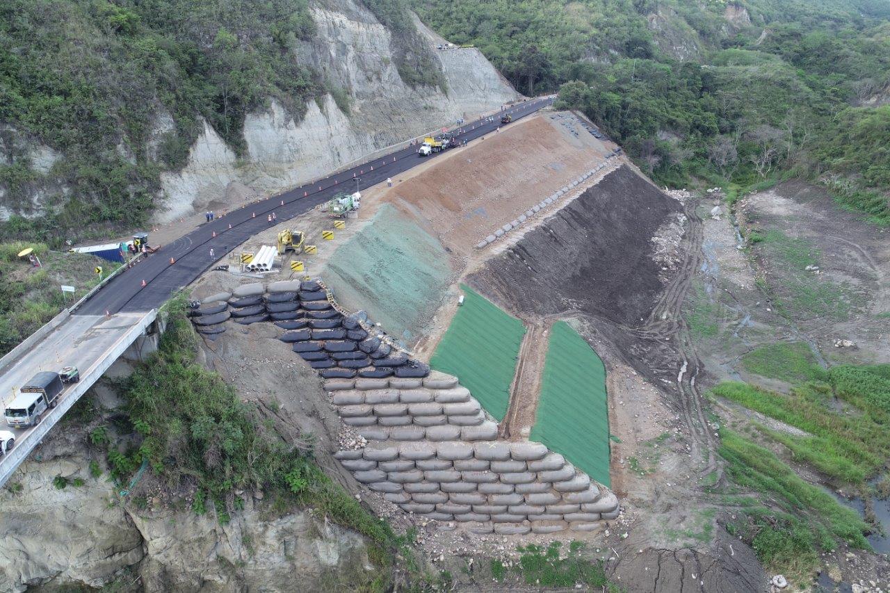 Las obras civiles se han ejecutado en unos 90 días con turnos de 24 horas y se está cumpliendo con los cronogramas establecidos. Para la fase de recuperación total de la vía, se instalaron alrededor de 2.200 mega bolsas cada una de un peso de 20 toneladas y un total de 45 mil metros cúbicos de material en los llenos, para darle estabilidad al talud inferior de la banca y a la instalación de la carpeta asfáltica.
