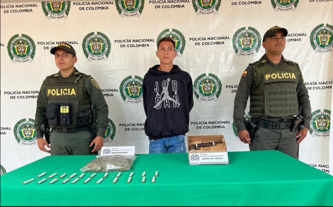 La Policía Metropolitana de Neiva en desarrollo de planes de vigilancia y control, logra la captura de un hombre de 21 años por los delitos de Porte Ilegal de Armas y Tráfico de Estupefacientes.