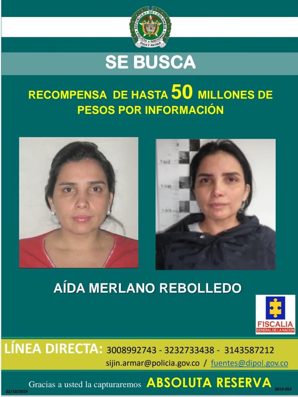 Este es el cartel con el que la Fiscalía ofreció una recompensa por 50 millones de pesos para quien dé información sobre el paradero de Aida Merlano.