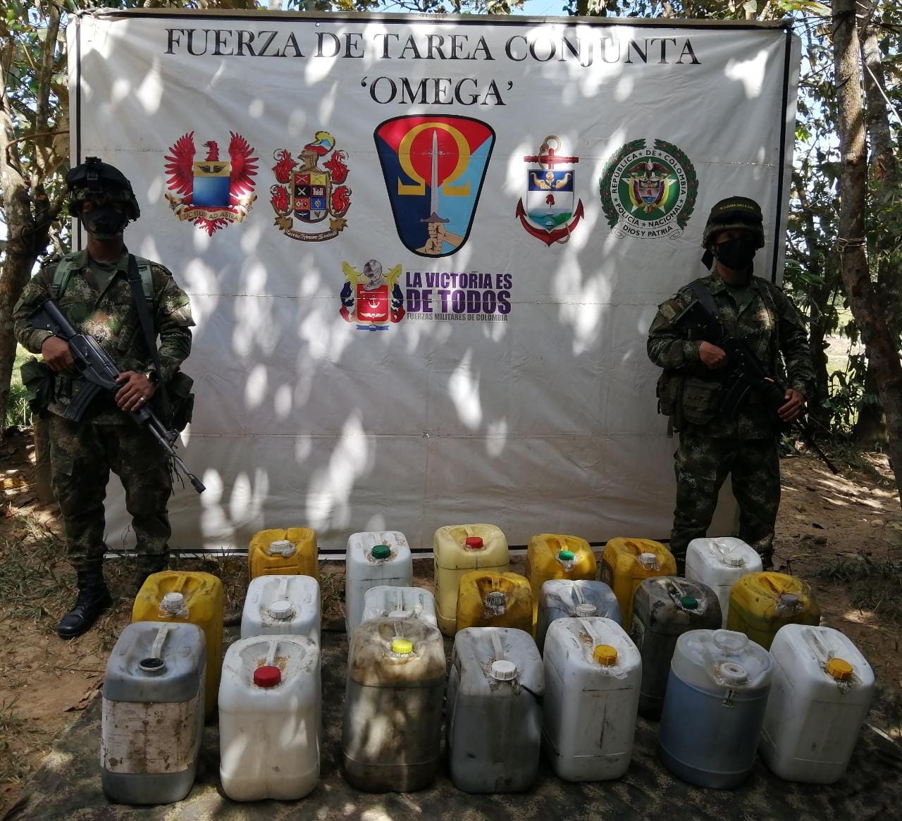 Tropas de la Fuerza de Tarea Conjunta Omega en desarrollo de operaciones militares, en las últimas horas hallaron 20 timbos plásticos los cuales contenían 100 galones de aceite quemado.