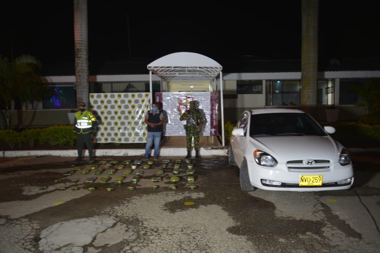 El decomiso se realizó en la vereda El Mármol ubicada en el municipio de Isnos Huila. Allí en un puesto de control, los uniformados detuvieron un vehículo Hyundai Accent color blanco para realizar una inspección en el cual se halló la sustancia ilícita que se encontraba distribuida en 45 paquetes.