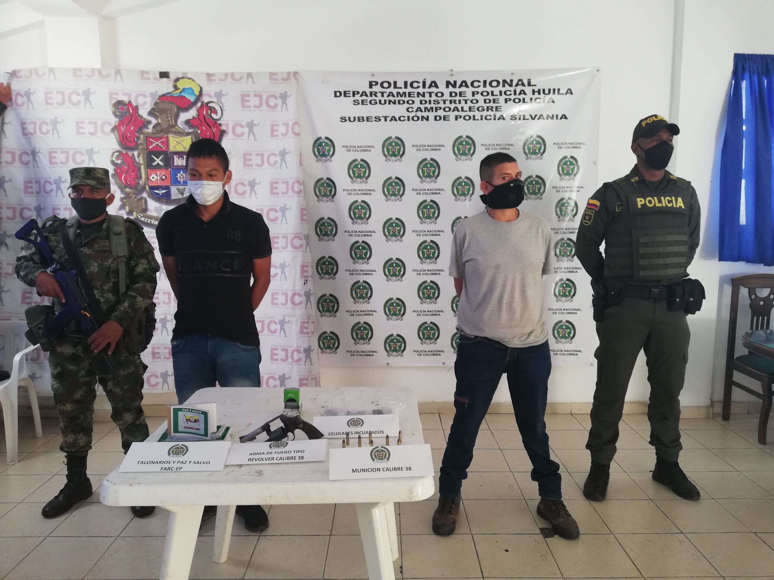 El operativo de captura fue realizado por personal de la subestación de Policía Silvania y Zuluaga con el apoyo de unidades del Ejército Nacional, luego que fueran informados de la presencia de dos hombres sospechosos en la zona de la vereda Miraflores entre límites de los dos centros poblados. De inmediato se coordinó el desplazamiento hasta el sitio, logrando la captura de OSCAR CERO BAHOS de 50 años y JAILER DUBAN MEDINA TOMBE de 27 años de edad, a quienes luego de interceptarlos y un registro personal, les fue hallado un arma de fuego tipo revólver con 8 cartuchos, 3 talonarios para notificación y paz y salvo con logos alusivos a las extintas FARC-EP y un sello de la segunda Marquetalia.