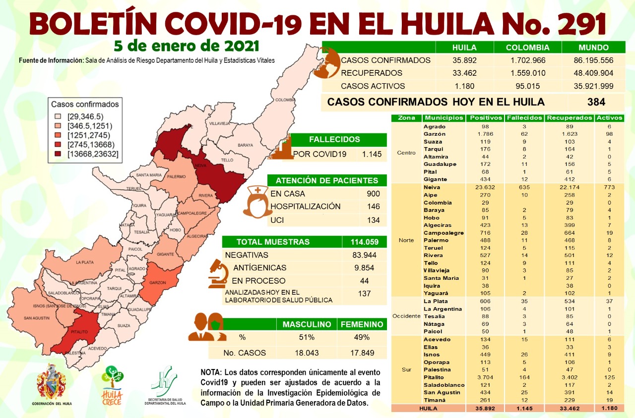 La Sala de Análisis del Riesgo del Huila confirmó 384 resultados positivos de Covid19, de acuerdo al boletín epidemiológico enviado por el Ministerio de Salud y Protección Social, los casos se distribuyen así:
