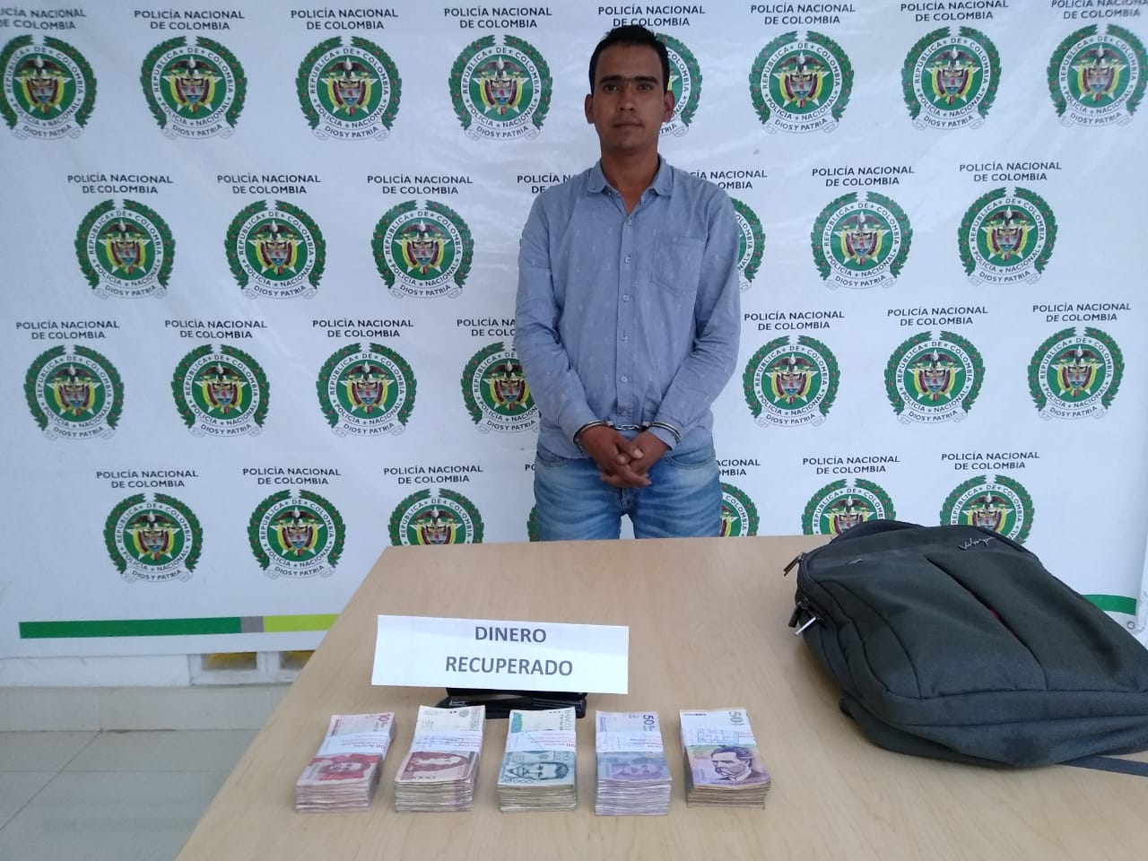 En un rapido operativo la policia da captura a JUAN DIEGO PERDOMO LOZADA de 24 años de edad, a quien le fue hallado el bolso de con el dinero hurtado.